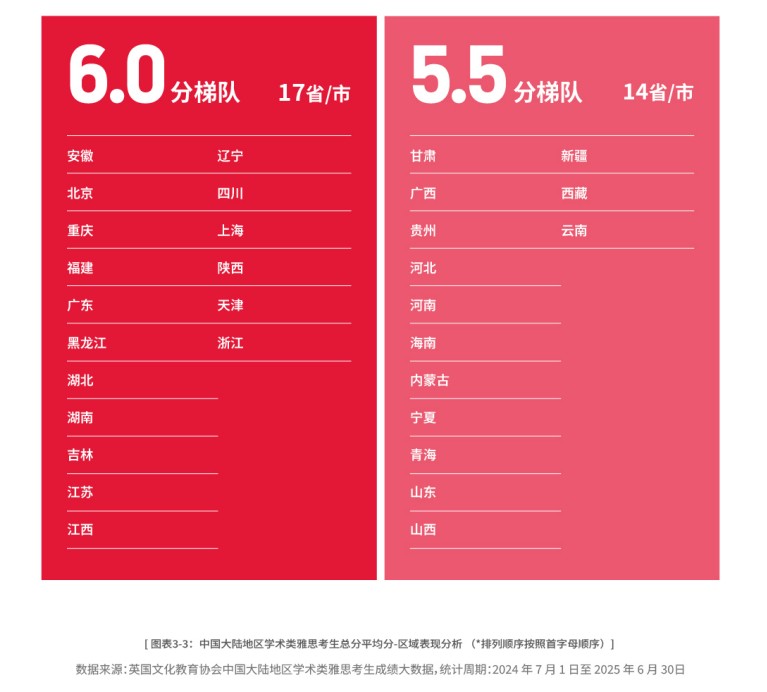 报告显示,2024-2025年度,持中国大陆护照的学术类雅思考生平均成绩为 5.9分,在全球参与排名的国家和地区中位列第35位。